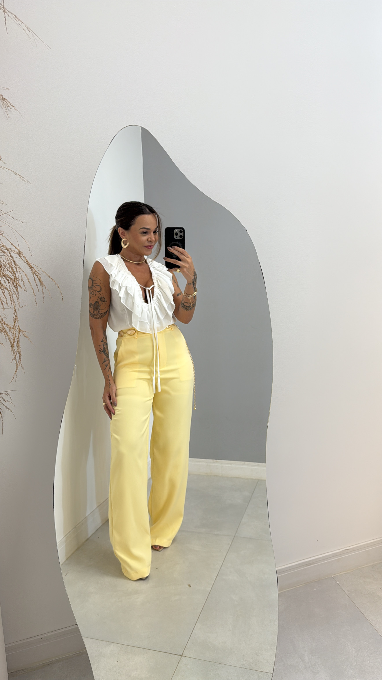 Feminina e sofisticada, apresenta decote profundo com babados que transmitem movimento e romantismo, além da amarração frontal que garante charme extra. Com tons delicados e clássicos, caimento impecável e versatilidade única, é a peça perfeita para compor looks elegantes em diversas ocasiões.