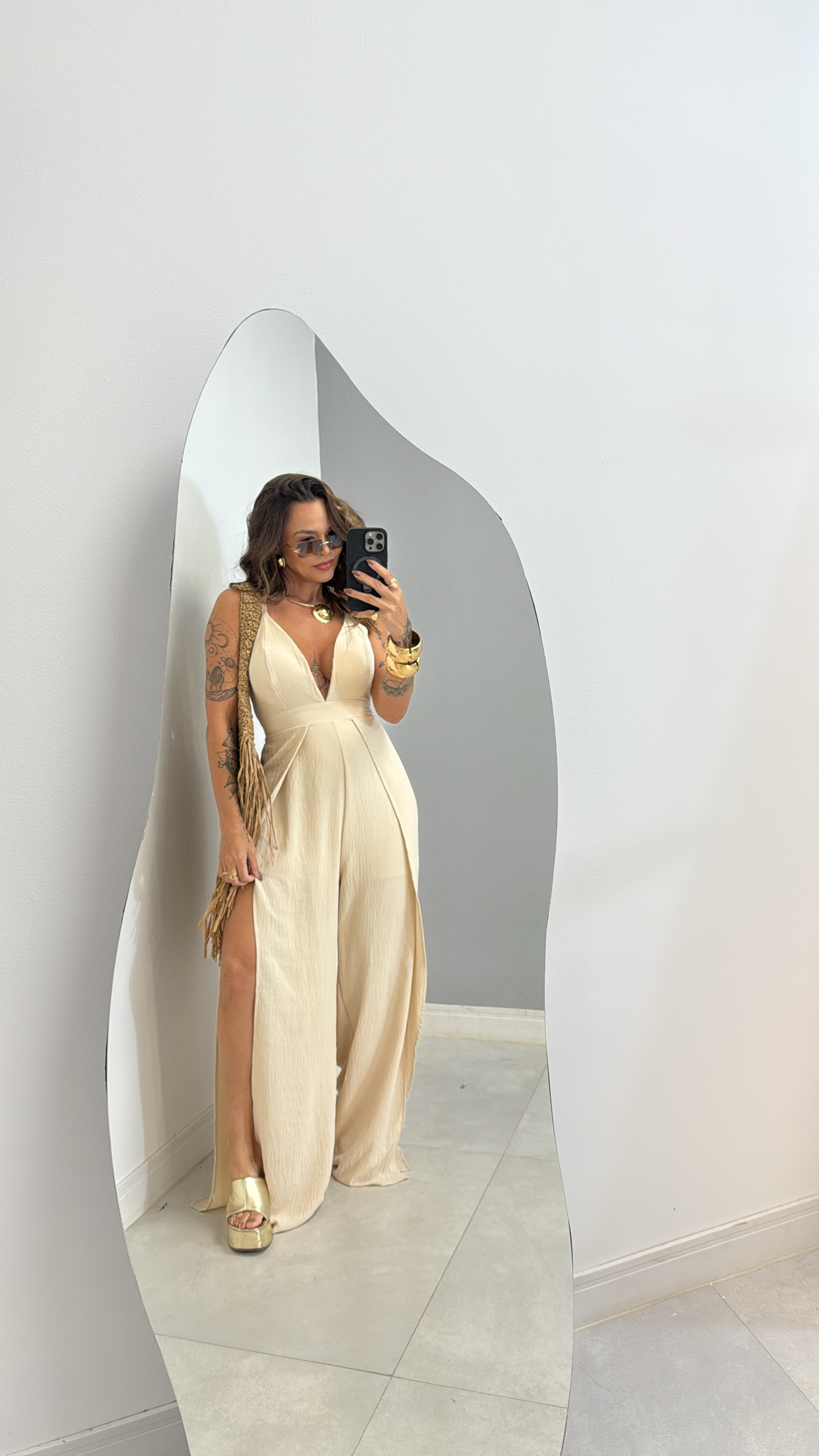 Moderno e sofisticado, o modelo longo em tom amarelo ilumina qualquer produção. Possui decote profundo em “V”, costas abertas com amarração e recorte que valoriza a cintura. As pernas amplas e fenda lateral garantem movimento, conforto e sensualidade na medida certa. Uma peça versátil, ideal para eventos, jantares ou produções estilosas de verão.