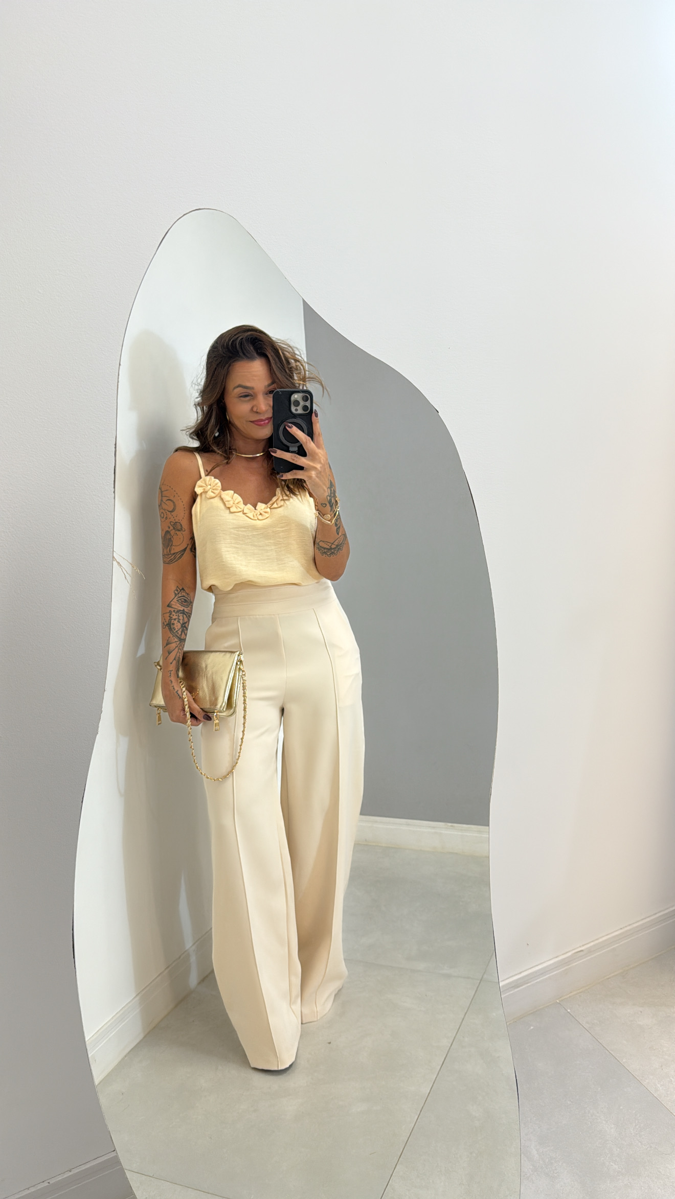 Leve e delicada, confeccionada em tecido fluido com detalhe em renda no decote, que adiciona romantismo e feminilidade à peça. Versátil e sofisticada, pode ser usada tanto em composições casuais quanto em produções elegantes de alfaiataria.