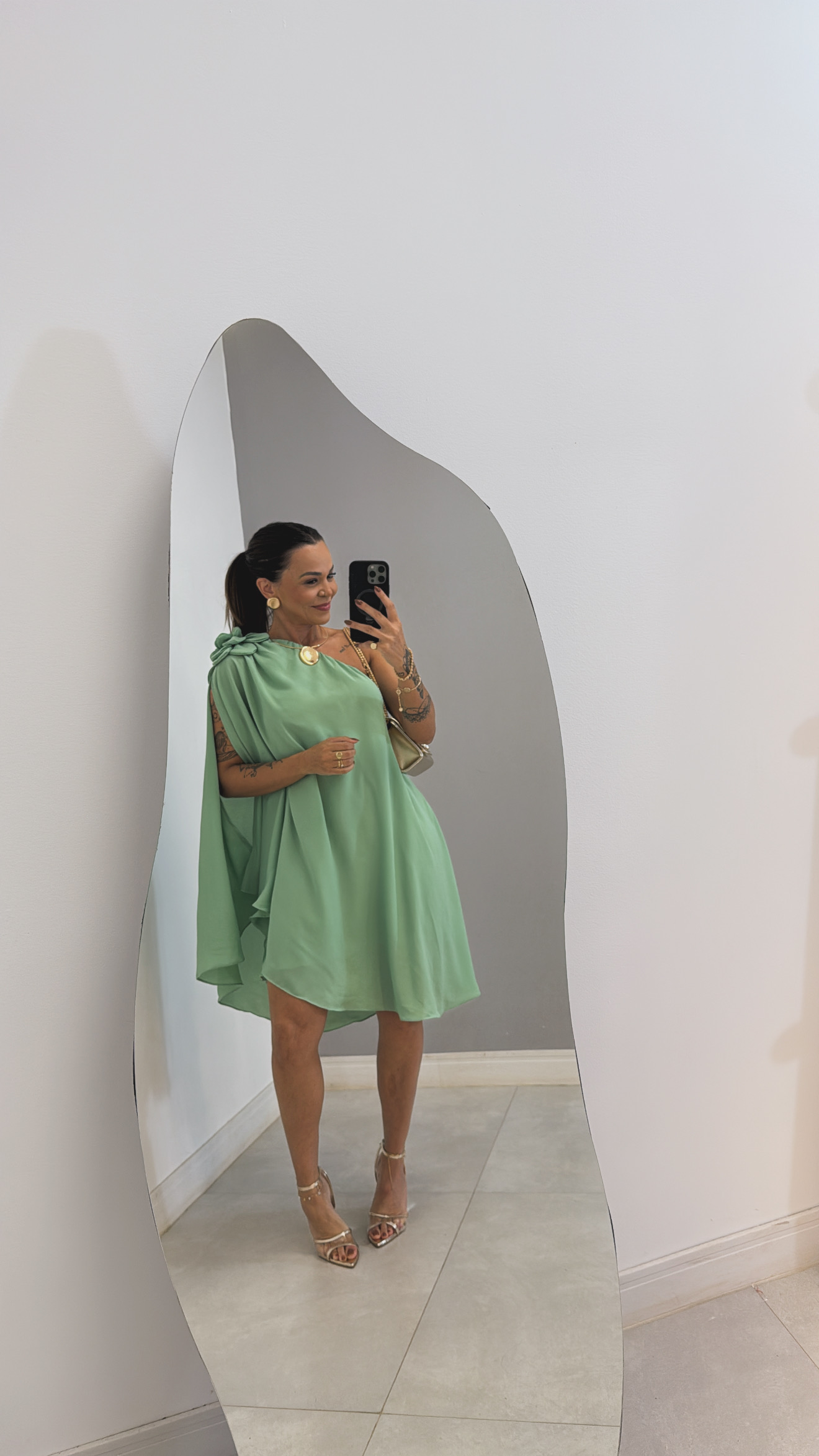 Vestido curto de um ombro só, com aplicação de maxi flor no ombro e caimento assimétrico fluido. Elegante e moderno, é a escolha perfeita para eventos especiais, garantindo leveza e sofisticação em um visual único.