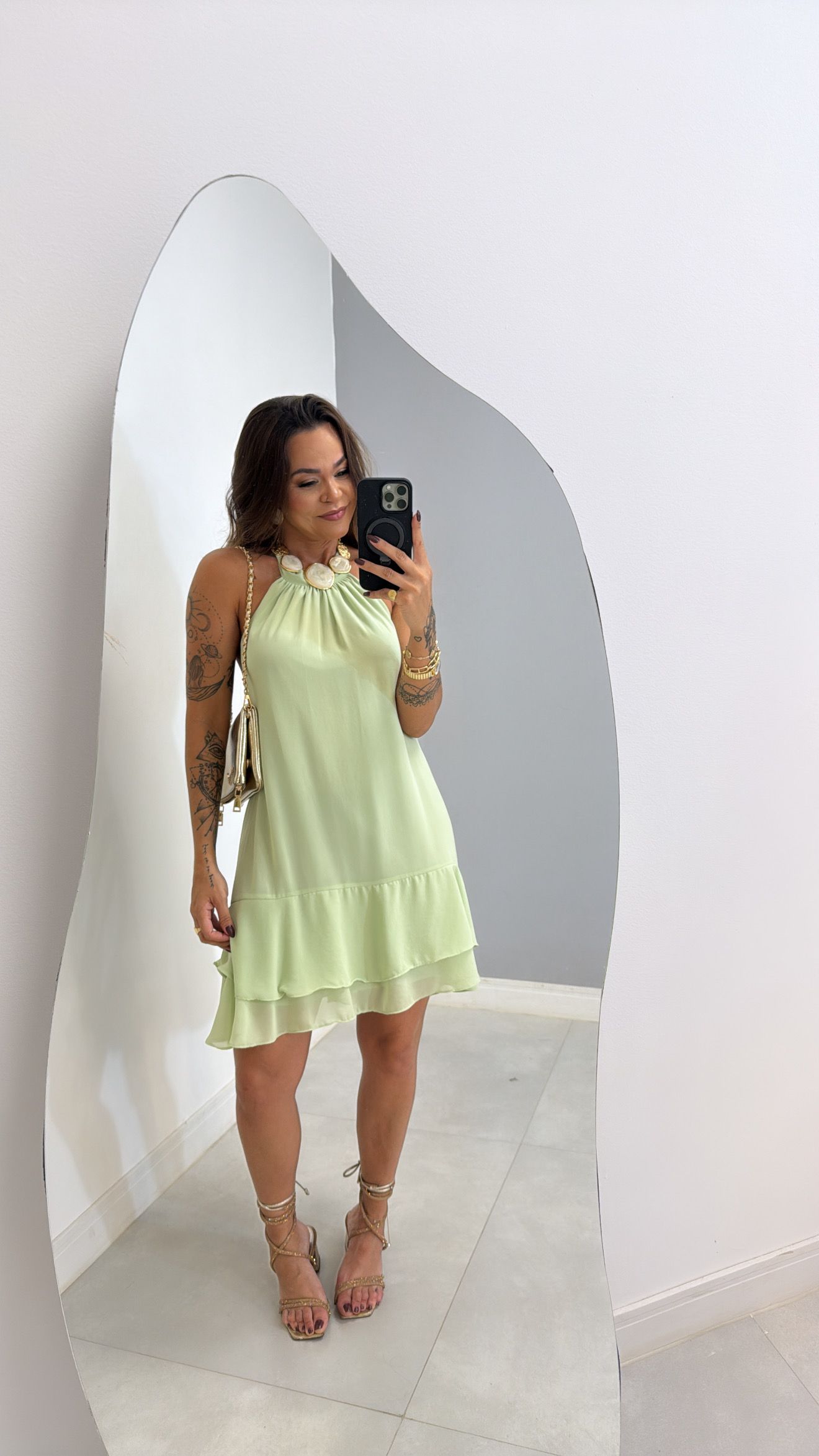 Vestido Priscila é um modelo curto e leve, em tom delicado de verde e amarelo pastel. Possui modelagem soltinha com detalhe de babados na barra, caimento fluido e decote halter adornado por aplicação em argolas, que traz sofisticação e modernidade ao look. Perfeito para ocasiões elegantes e frescas.